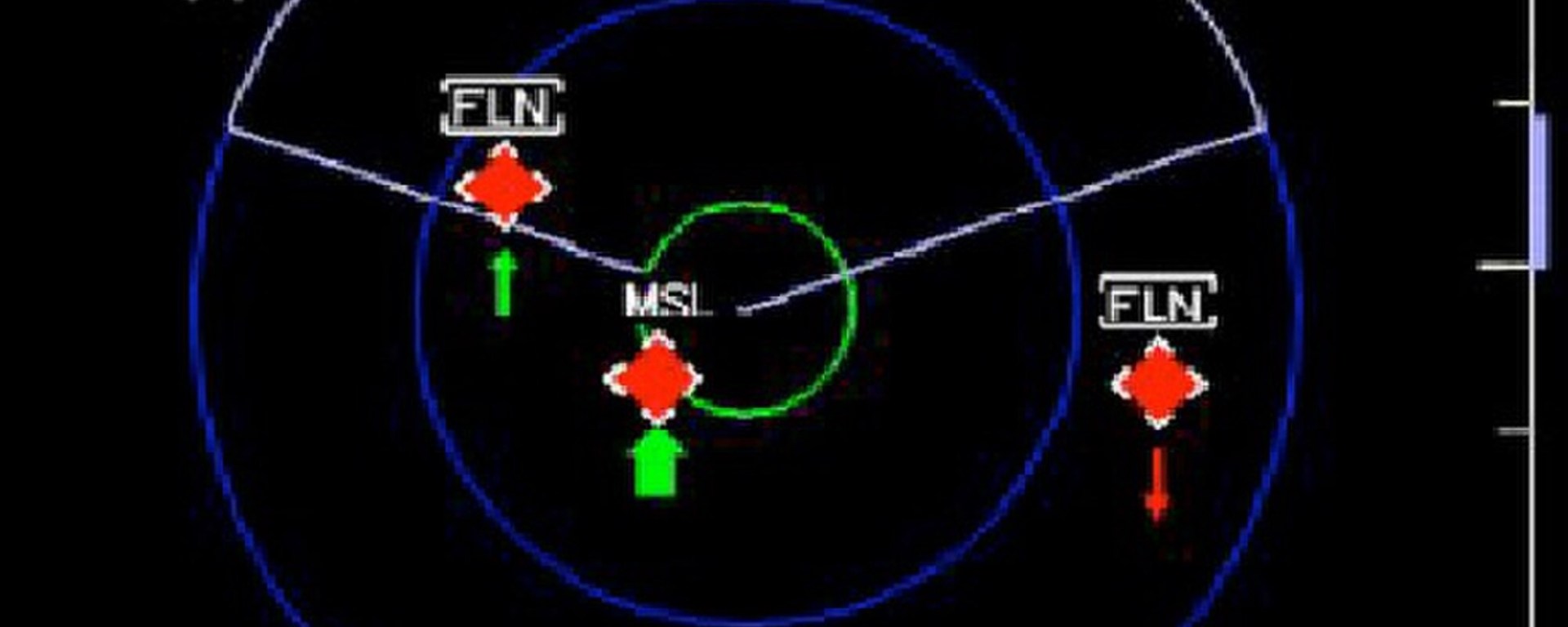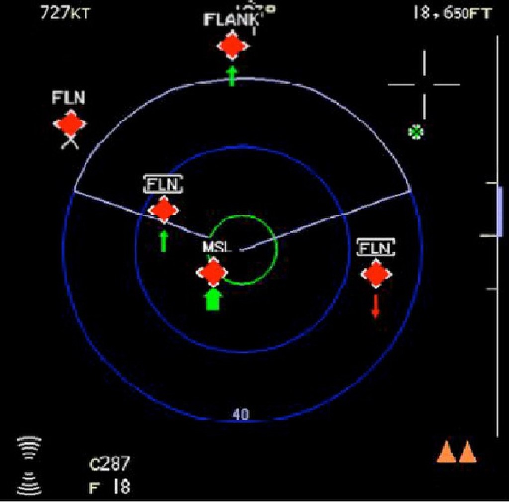 DASS Display, showing targets detected by the Missile Approach Warners (MAW). Down left: System online (hourglass-shaped symbol) and dispenser numbers (C = chaff, F = Flares). Down right decoy status. Right side the elvation bar from ±60°, with marks at +5°, 0° and -5°. The coloured arrows may indicate rate of climb (green) or sink (red) by their thickness. (Wikimedia Commons)