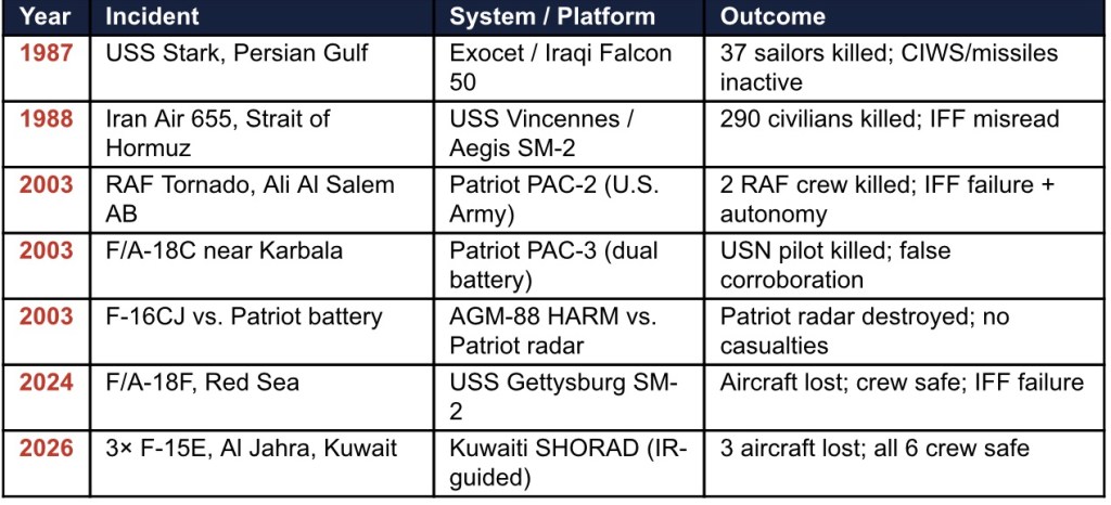 Persian Gulf Fratricide / Misidentification: Selected Incidents 1987–2026